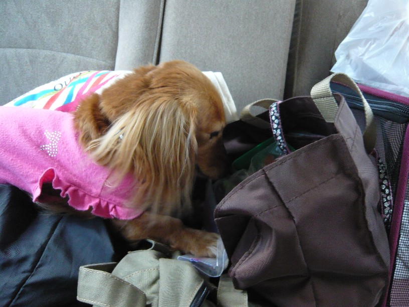 お出掛け用バッグの中を物色し、中にあったおやつ食べようとしてたみたい