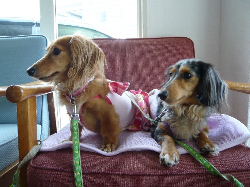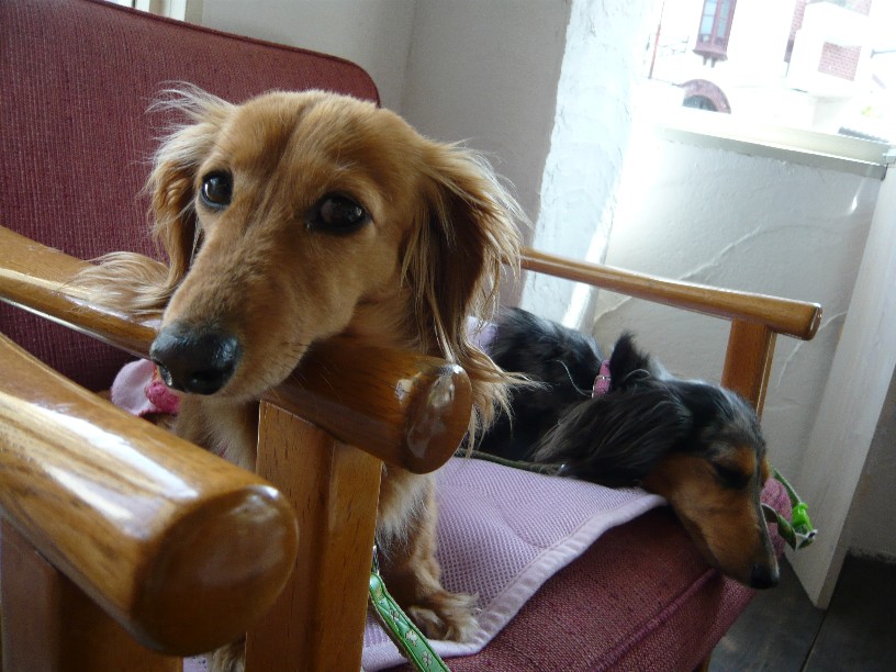 ちょこさんは肘掛にアゴ乗せで、ヴァ二さんはフセで、2ワンとも