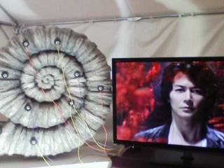 会場のロビーに飾られた、アンモナイトとTOSHIBA・レグザ