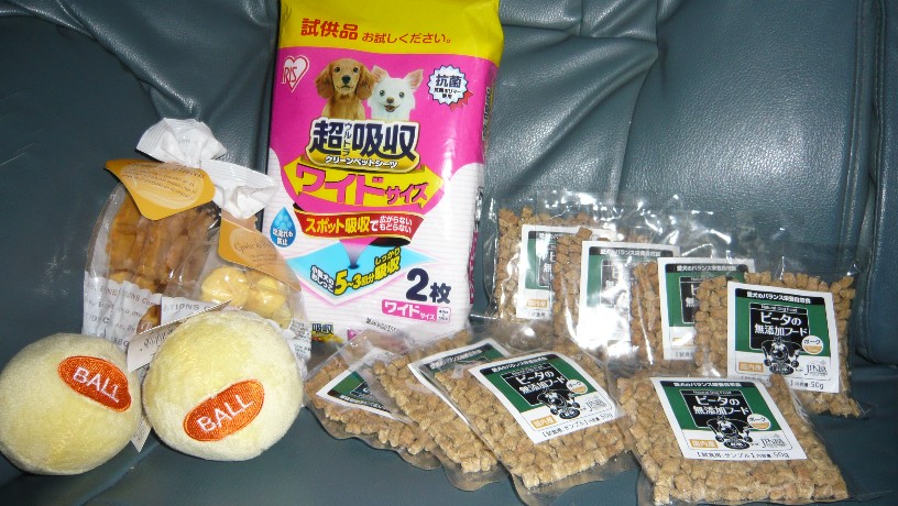 おもちゃとおやつとフードのサンプルの入ったお土産を二ついただきました
