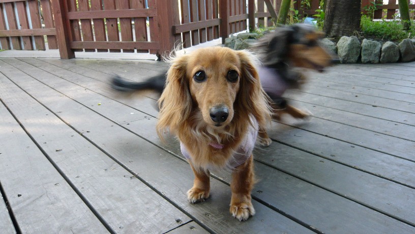 おすましちょこちゃんの後ろを駆け抜けるヴァニちゃん