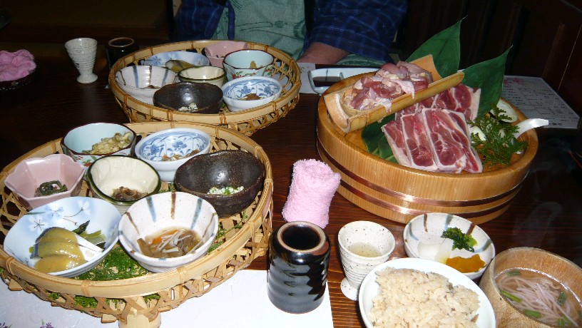 前菜は季節の籠盛、山女魚の塩焼き、鴨蕎麦、茶碗蒸しなど・・・