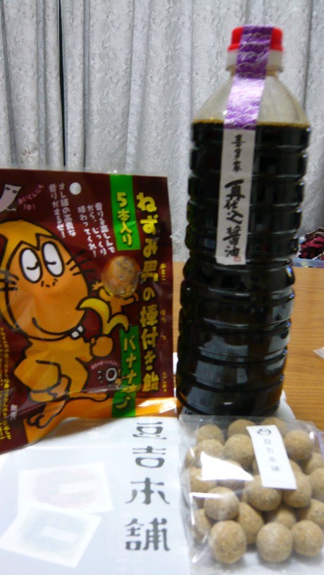 お土産は豆吉本舗の黒胡麻きな粉豆、喜多家の再仕込醤油、ネズミ男のキャンディ