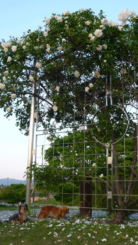 ちょこさんとヴァニさんが遊んでいる上には白い薔薇が咲いてますよ