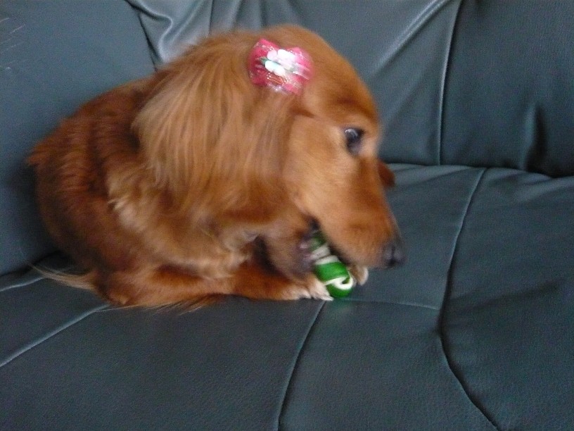 ちょこさんは動かずにそのままソファーでカミカミし始めました