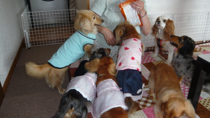 おやつのボーロを持つtomoさんに群がる、食いしん坊3人娘は・・・