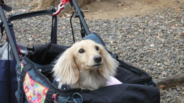 ゆっきぃさんちのキャバリアのエルちゃんね~、カートに乗ってゆっきぃさんの