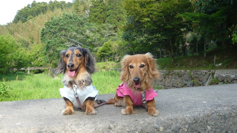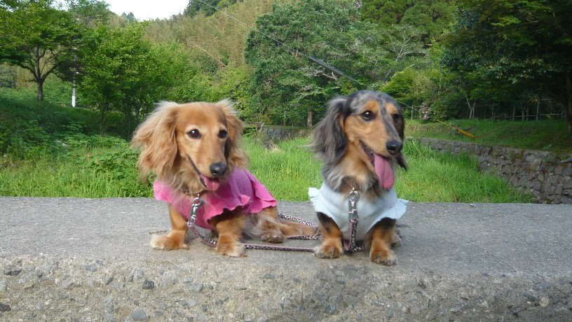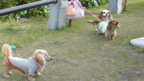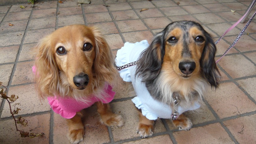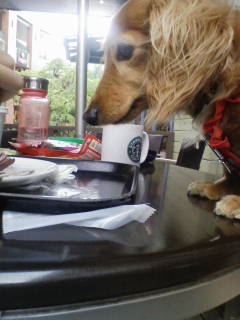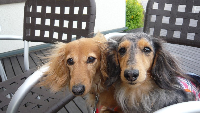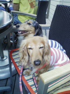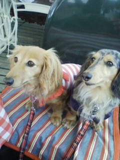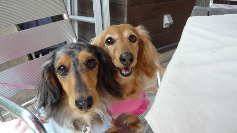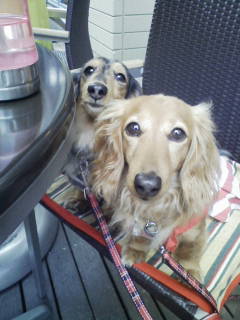 2わんダックスが一緒にお茶してるのが珍しいのか・・・