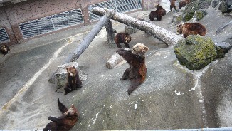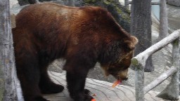 飼育員さんからお肉をもらったクマさんは、他のクマさんに奪われないように高い場所で