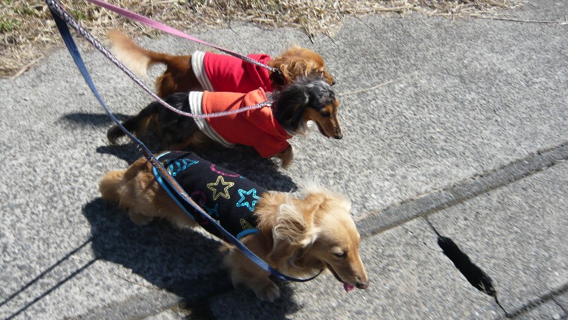 あっくんのリードを預かって3わんで並んで歩きます。