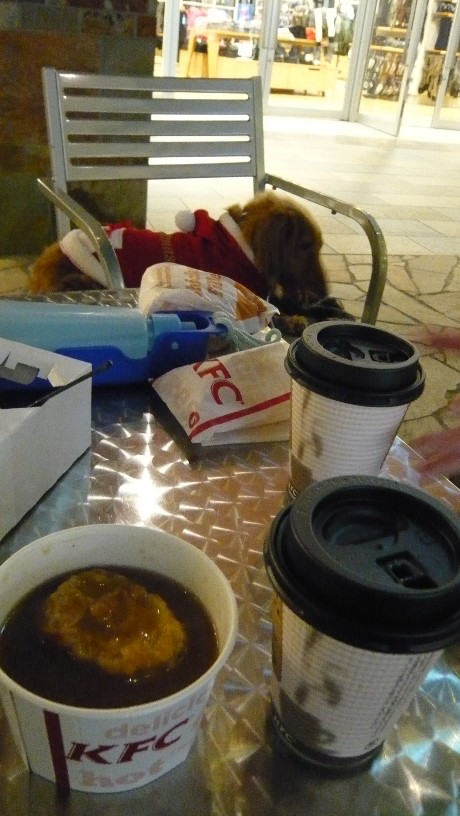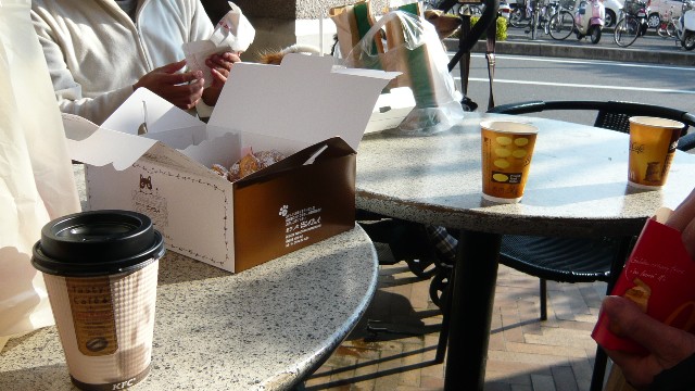 それぞれモス、マック、ケンタで買ってきてテラス席でお昼ごはんを