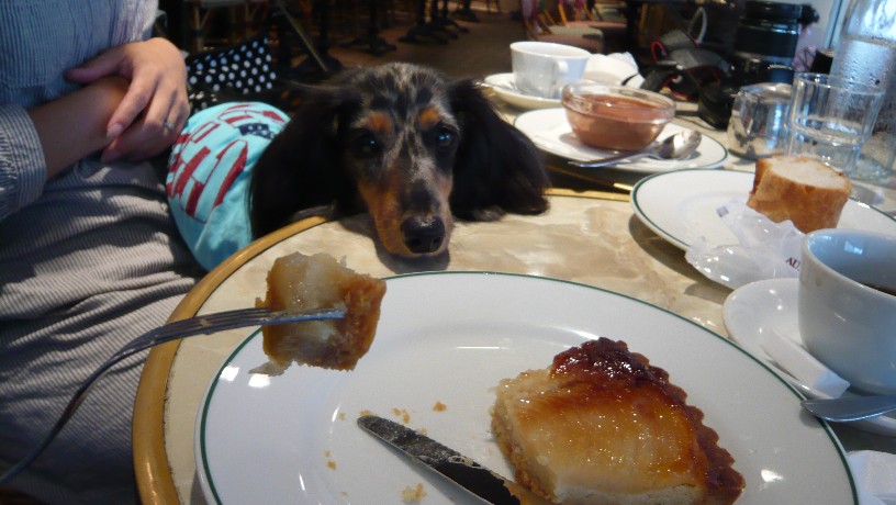 ワタシさんのお膝の上ではわたしの食べてる洋ナシのタルトをじっと見つめるはるくん