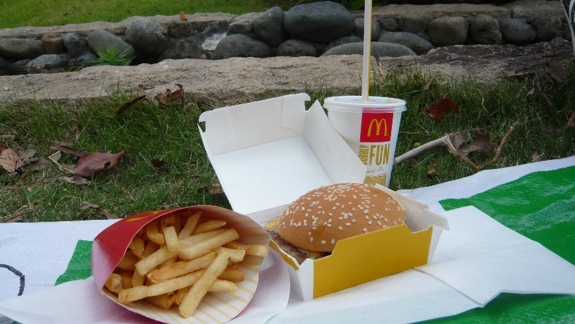 ハンバーグを食べようと咥えたけど、大きくて噛めないのでハンバーグは
