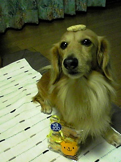 お誕生日にわたしが贈ったおやつのクッキーを頭に乗っけたお写真を