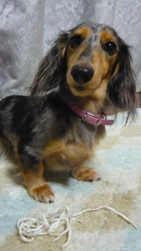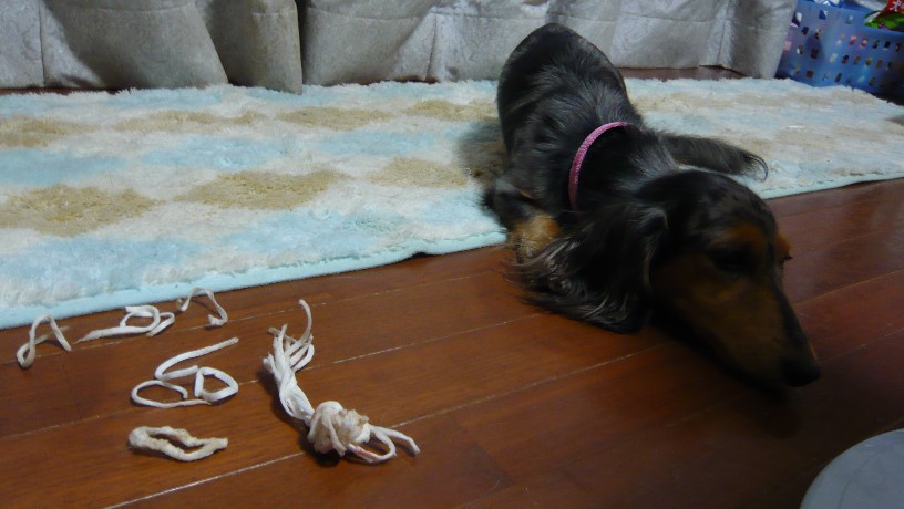 リビングにはお出掛け前にあげたおやつのガムの残骸が散乱