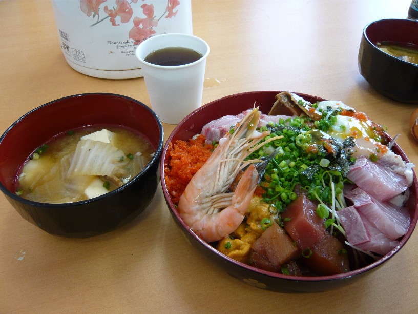 で、こちらがわたしの食べた海鮮丼・お味噌汁(アラ汁)付きで~す!