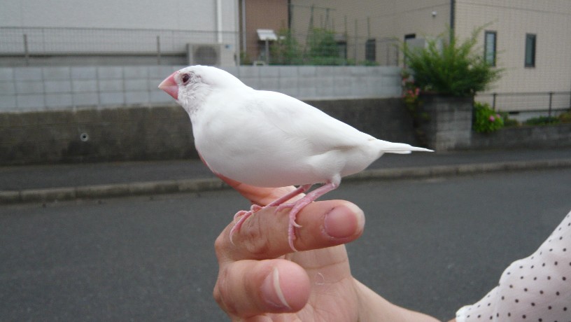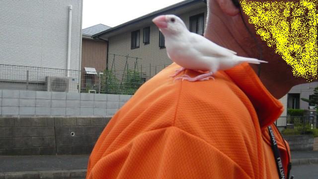 ご近所さんの肩に乗ってお散歩してたのは文鳥のミクちゃんです。
