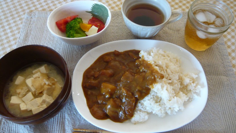ランチは野菜たっぷりのカレー、ご飯は発芽玄米です。