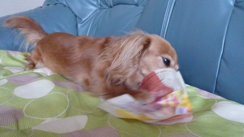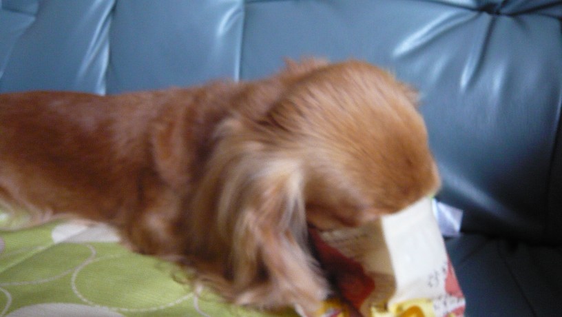 ちょこさん、そのままもっとマズルを奥まで突っ込み、お顔がスッポリと袋の中に~
