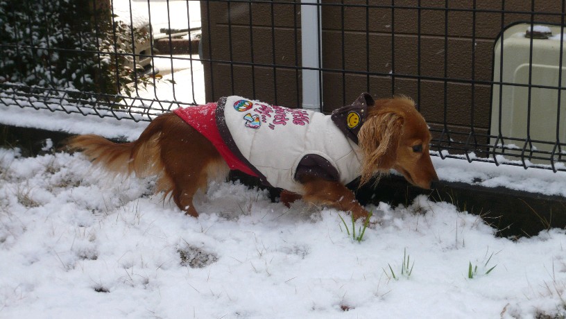 雪を感じさせてあげようと、雪も止んだので一緒にお庭へ出てみました。
