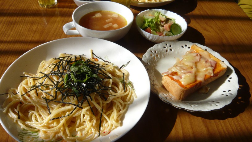 めんたいクリームパスタ、ピザトースト、コンソメスープ、サラダです。