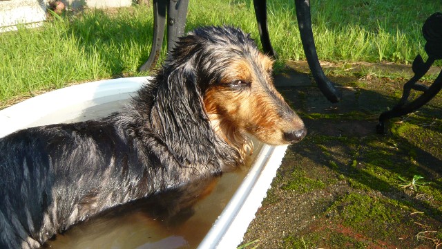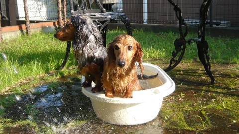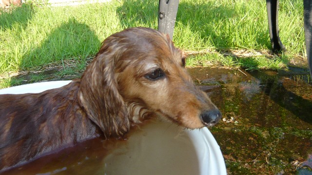 いつもちょこさんとヴァニさんをシャンプーする時に使うベビーバスをプール代わりに
